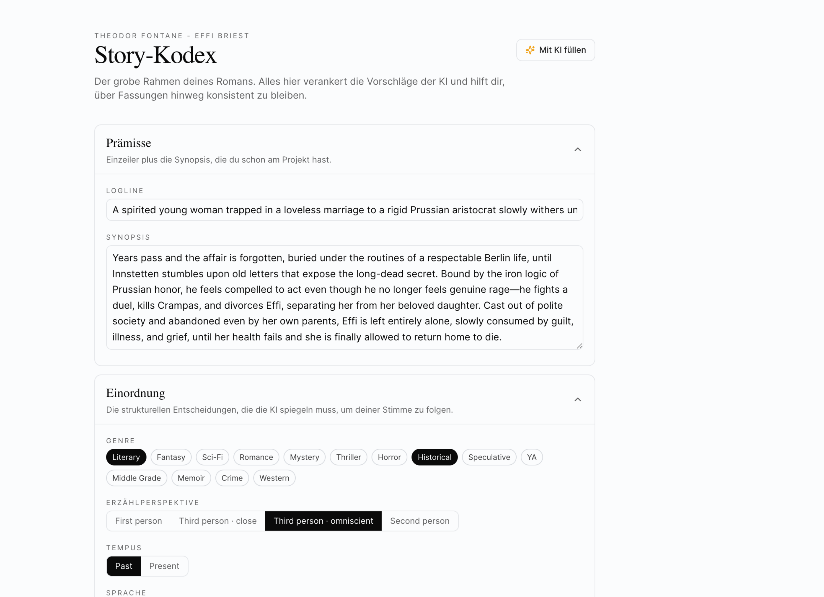 Wenn du mit einer fertigen Roman-Idee startest und das Gerüst schnell aufstellen willst, gibt es eine Abkürzung: das Codex-AI-Prefill. Du wählst einen Autor, dessen Stimme deinem Roman nahe ist — etwa Kazuo Ishiguro, Hilary Mantel oder Ursula K. Le Guin — und Novumdraft schlägt dir einen Start-Codex vor: Tonfall, Stil-Vorgaben, Welt-Notizen, in der Klangfarbe dieses Autors. Du übernimmst, was passt. Editierst, was nicht passt. Du verbringst zehn Minuten statt zwei Stunden mit dem Aufsetzen.