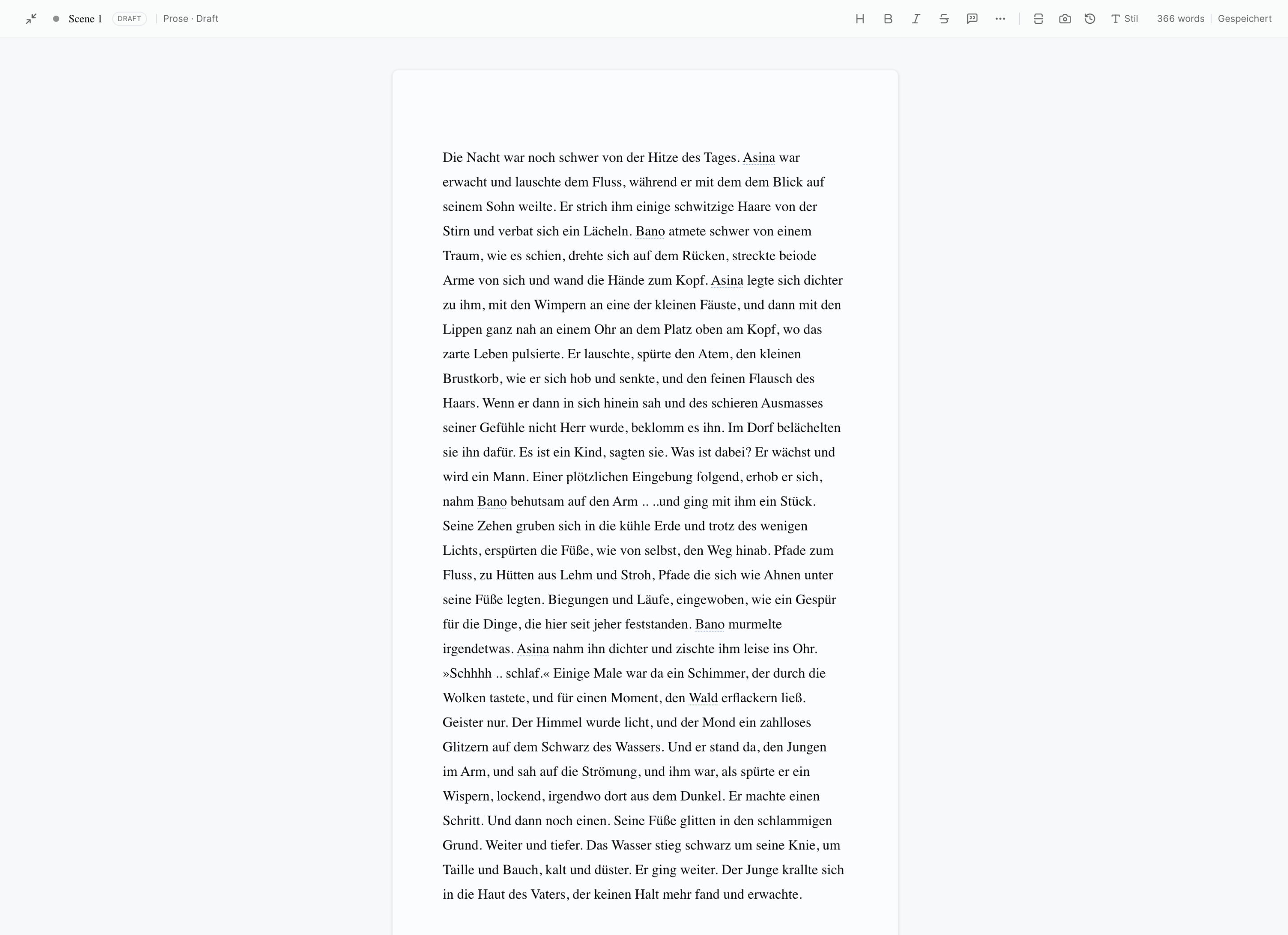 Sobald du im Manuskript einen Namen erwähnst, der im Codex existiert, wird er automatisch markiert — du siehst eine dezente Hervorhebung, und der Roman weiß ab diesem Moment, dass diese Szene mit dieser Figur zu tun hat. Du brauchst keine "Charakter-Tags" manuell zu setzen. Du tippst "Lara öffnete die Tür", und sie ist drin.