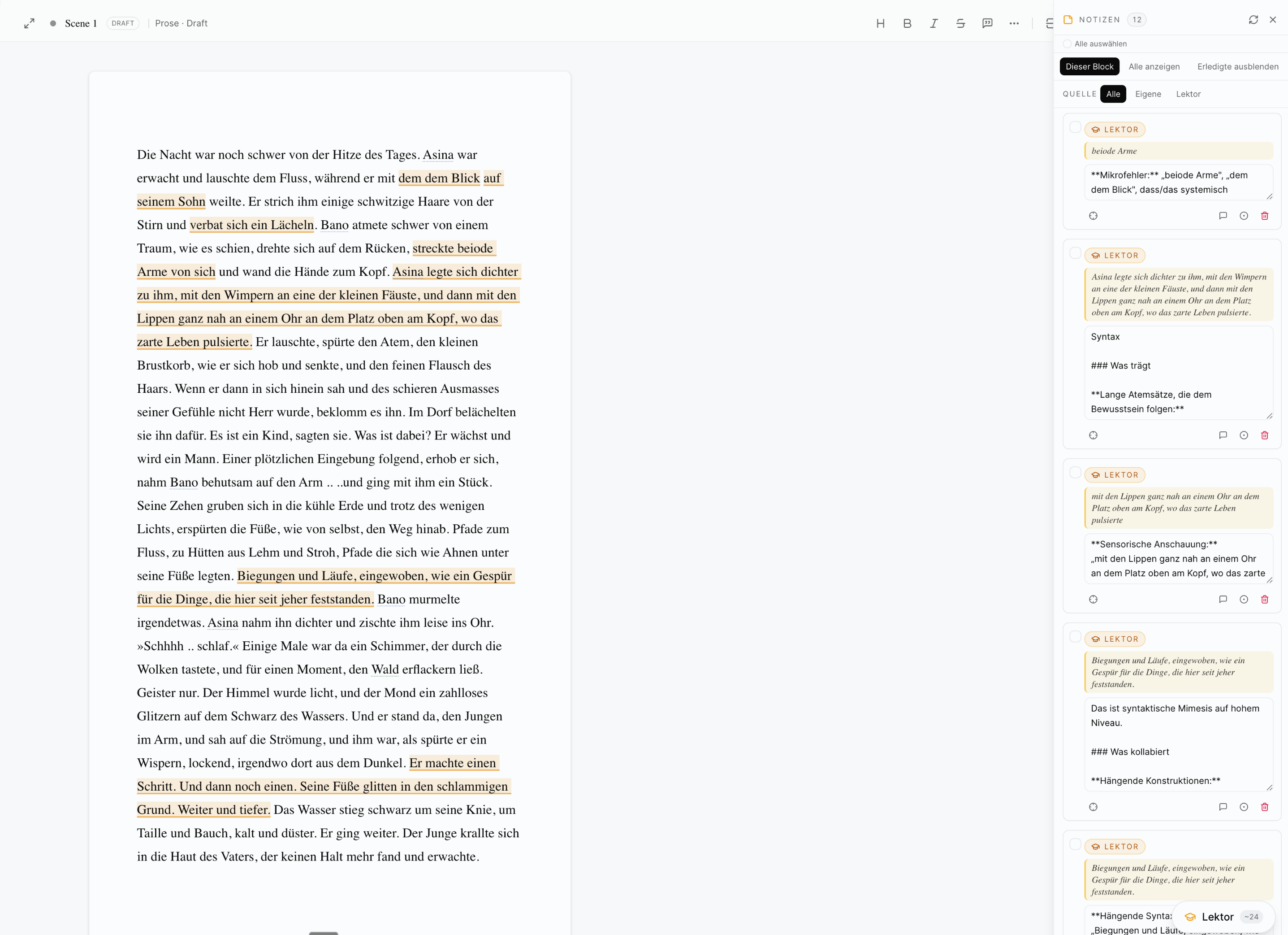 - Bei der Recherche — lies alle Szenen an einem bestimmten Schauplatz. Stimmt die Atmosphäre überein? Hat sich die Beschreibung verschoben?