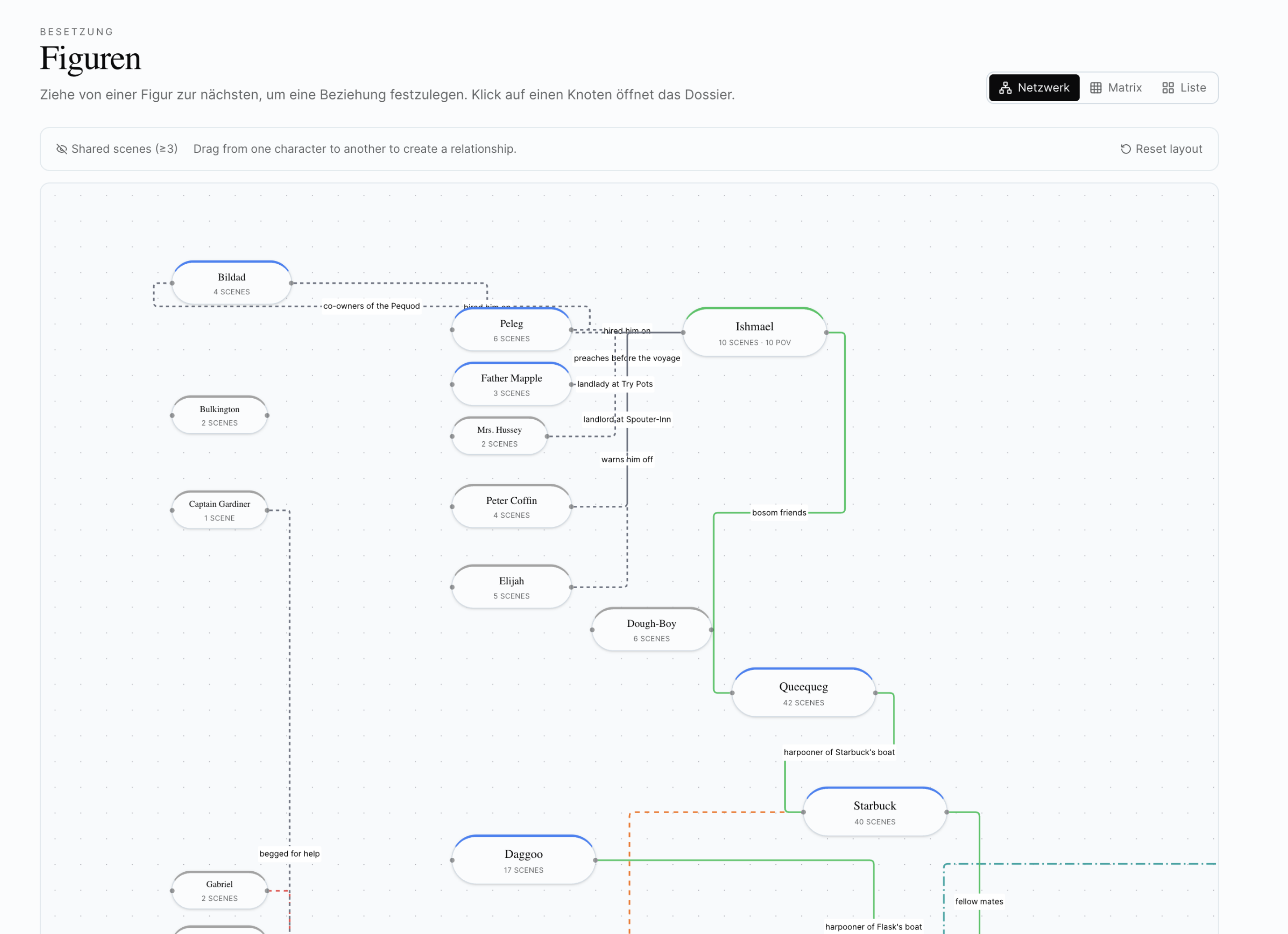 - Netzwerk — Figuren als Graph mit Verbindungen. Wer kennt wen, wer ist mit wem verfeindet, wer trifft wen in welchen Szenen. Klick auf eine Figur, du siehst ihre direkten Beziehungen. Besonders wertvoll für Romane mit komplizierten Familien- oder Macht-Strukturen.