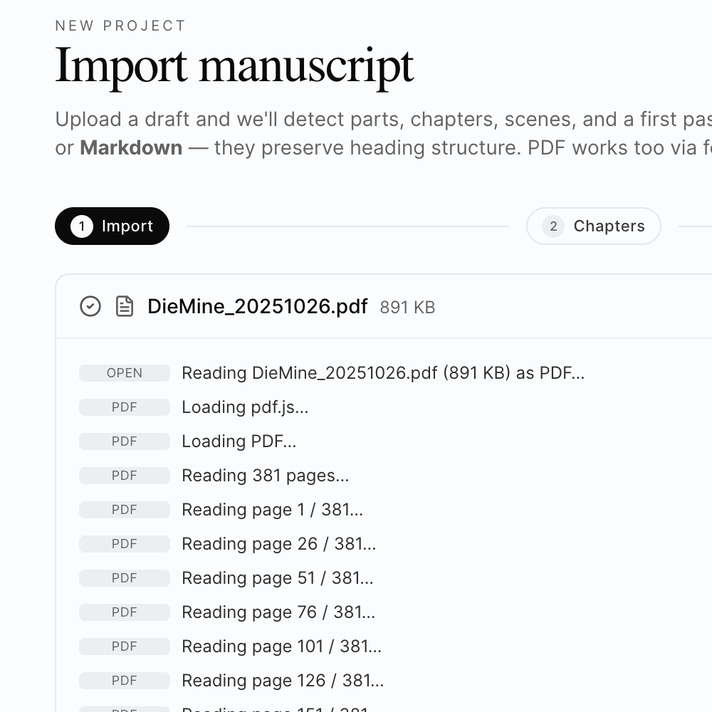 Bring deinen bestehenden Roman aus Word oder Markdown mit. Strukturen werden erkannt, der Rest landet in bearbeitbaren Szenen-Blöcken.