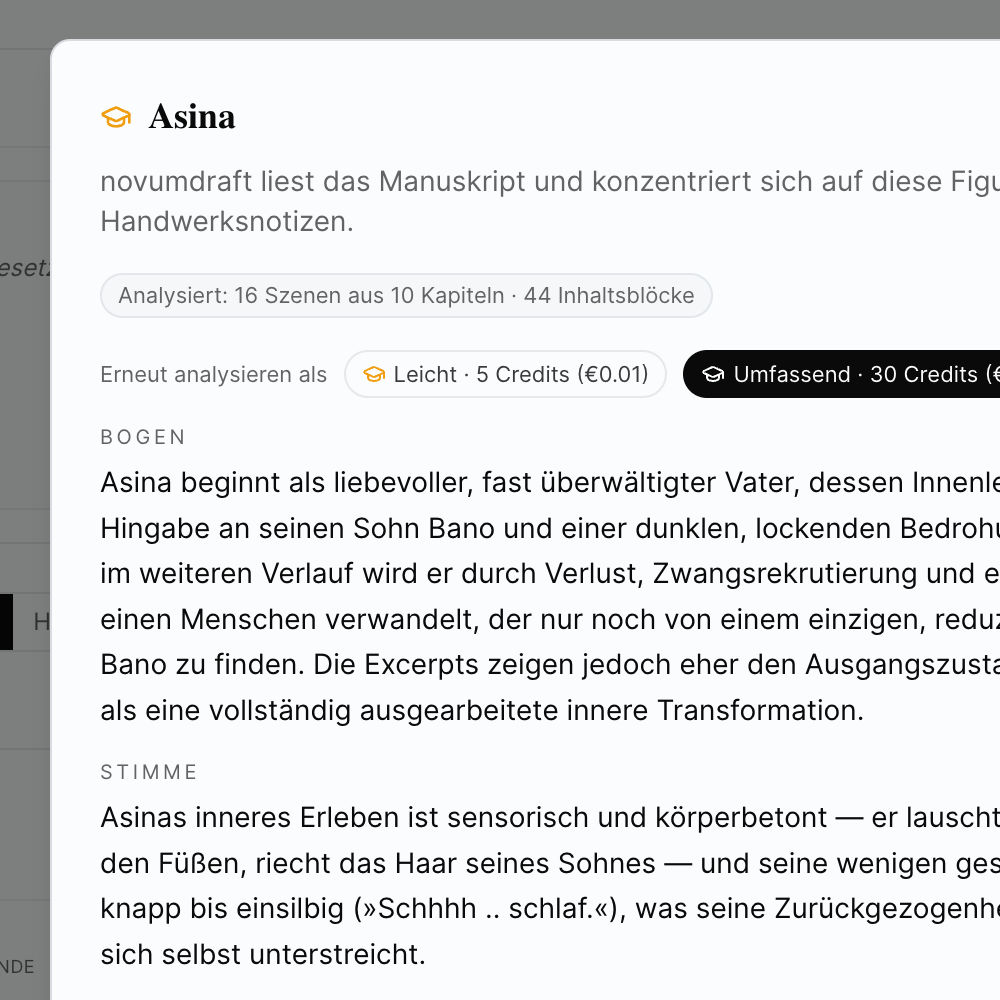 Manuskript-Analyse teilt sich das Lektorats-Credit-Budget. Eine Light-Analyse kostet weniger als eine Heavy-Analyse. Der erste Lauf pro Roman pro Monat ist in jedem Plan inklusive.