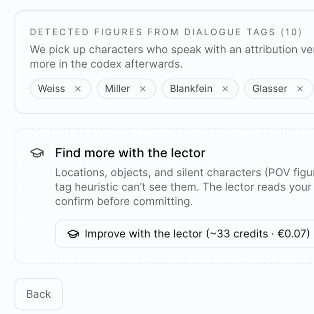 - Codex anpassen an die Realität — wenn die Analyse einen anderen Tonfall liest als der Codex behauptet, kannst du den Codex anpassen. So bleibt der Lektor in seinen Antworten konsistent mit dem aktuellen Stand.